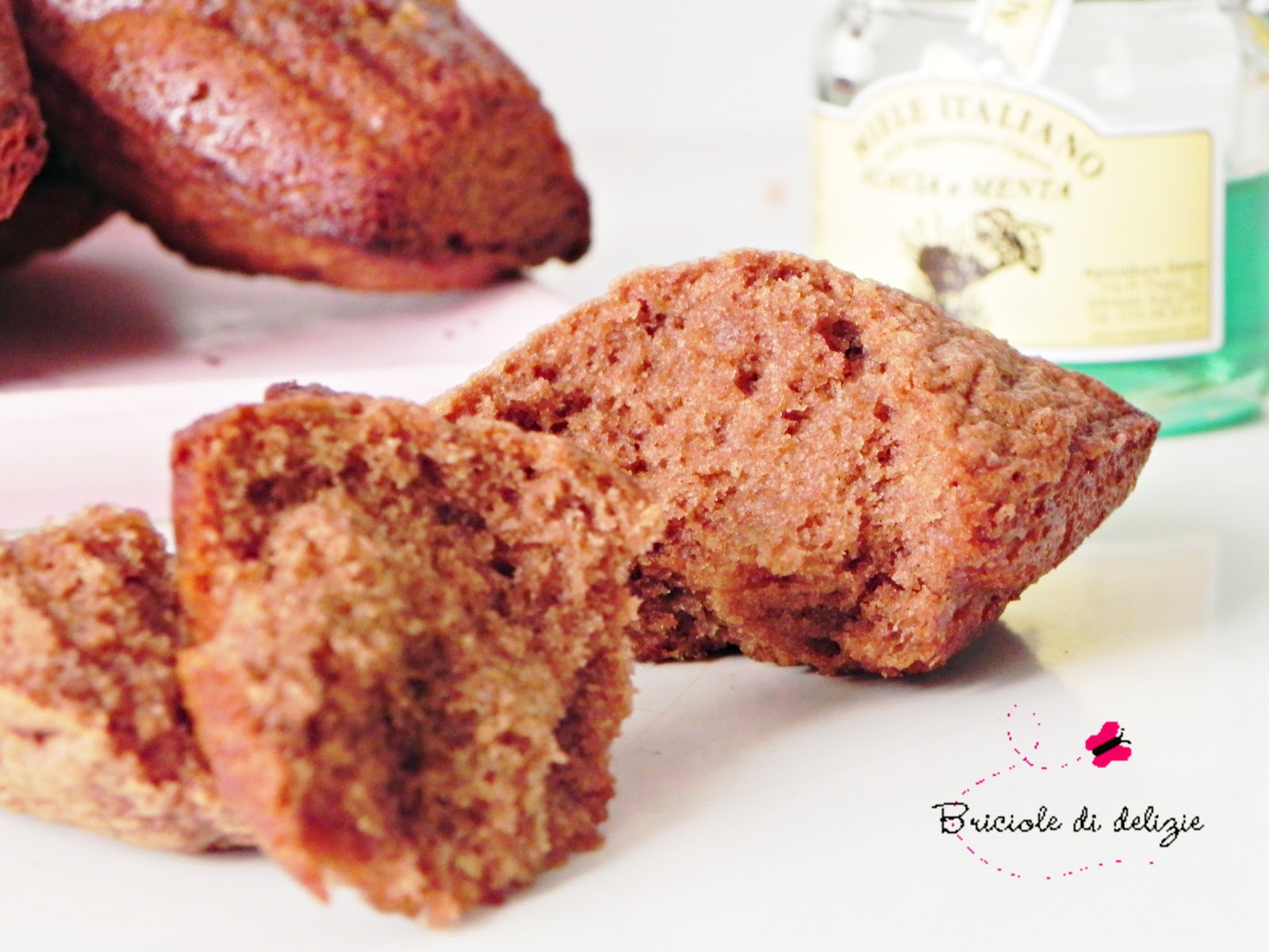 Lo scorso fine settimana, a San Bernardo, una piccola frazione della mia città, c'è stata la fiera degli animali. Era la prima volta che ci andavo e confesso che non avevo la minima idea di che cosa aspettarmi di trovare! Bene, nonostante questo sono rimasta contentissima di quella visita: signori e signore (più o meno anziani) che lavorano la terra e con la natura hanno "messo in mostra" ciò che li fa vivere ogni giorno, ovvero i propri animali come asini, galline, mucche, caprette, coniglietti... e i prodotti che ne derivano (latte di capra, di mucca, uova...). Ma, in particolare, sono rimasta sorpresa da una signora che si è portata dietro l'arnia con tutte le sue api. Non so per quale motivo, ma mi ha fatto uno strano effetto, quasi tenerezza oserei dire :) E proprio da questa signora ho acquistato tanti piccoli barattolini di miele di acacia di ogni tipo: alle albicocche, al limone, alla menta, con le nocciole... Tutti coloratissimi e uno più bello (e buono! Provate il miele con le nocciole a pezzi: è un carico di calorie, sì, ma ne vale assolutamente la pena) dell'altro. Appena tornata a casa mi sono rimboccata le maniche e ho preparato queste madeleine squisite! Il miele d'acacia alla menta ha un gusto raffinato e delicato, davvero buonissimo. Poi il binomio menta/cioccolato lo amo da sempre *.*